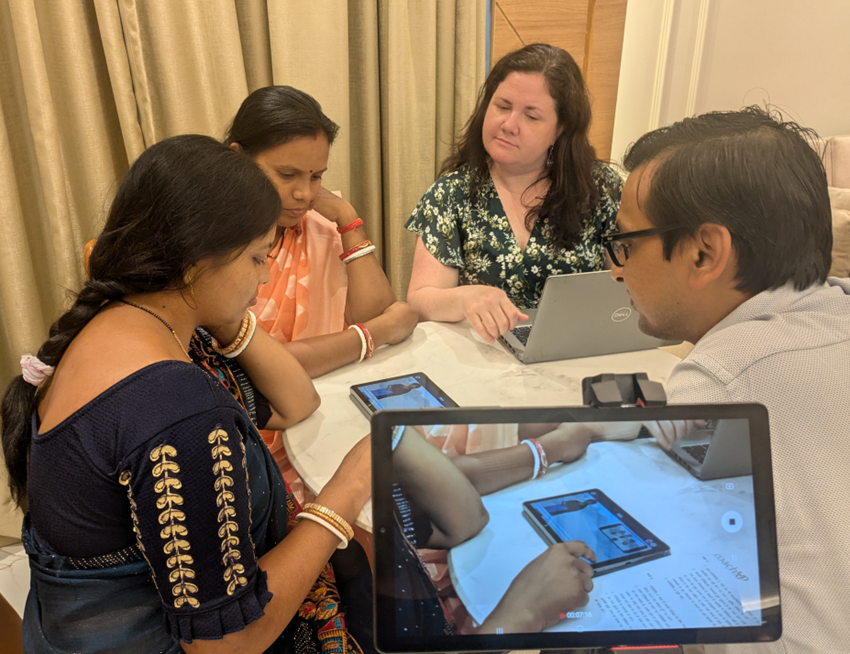 They met with more than 20 Trickle Up coaches and program staff. Some coaches who tested the app are from PVTGs, or Particularly Vulnerable Tribal Groups, classified by the Indian government in order to focus on improving the living conditions of minority groups living in very rural areas. Other coaches are from a nearby region. The coaches are referred to as “Smart Sakhis” due to their work guiding and mentoring other women as they move away from extreme poverty.
