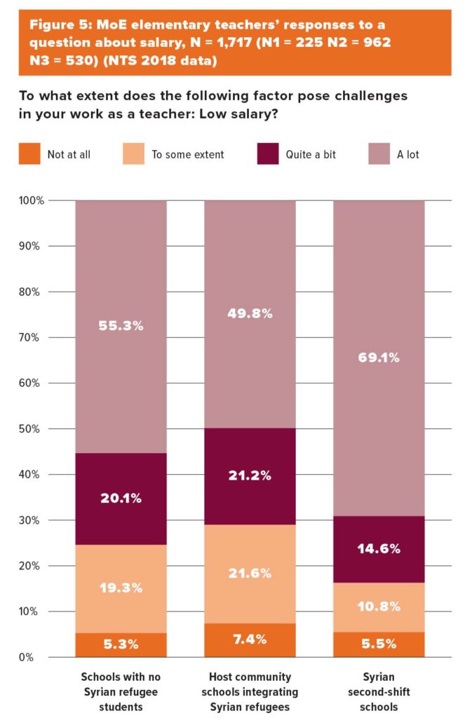The latest report focuses on Jordan, home to over 200,000 Syrian refugee children who are eligible to enroll in formal schooling. In this context, most teachers are Jordanian citizens who are “daily paid,” meaning they lack a contract with a defined timeframe. When asked to what extent a “low salary” challenged a teacher’s ability to work, nearly 70% of respondents in schools that dedicate a second shift to Syrian refugee learners said, “A lot.”