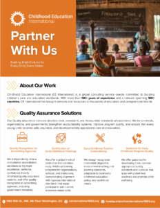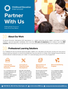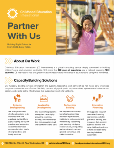 Childhood Education International (CE International) is a global, non-profit consulting service that partners with governments, NGOs, education systems, and institutions to strengthen the systems that support young children’s learning, development, and wellbeing.